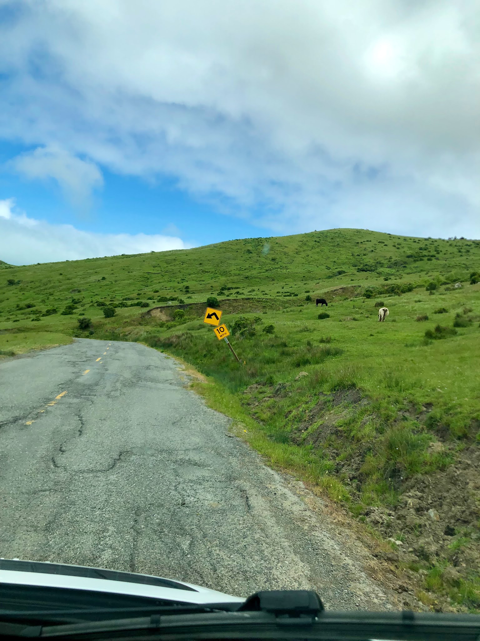 We leave the forest and emerge into open-range land high above the Pacific Ocean. The road in this area reminded me of the Fruka Pass in Switzerland. Tight steep turns and great views with cattle on the side of the road. Here the views are of the Pacific Ocean and not the Swiss Alps. The cattle in Switzerland are behind an electric fence, here they are free-roaming. The road is not as smooth as in Switzerland but the views are as good.